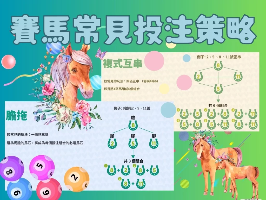 A:賽馬玩法有獨贏、連贏、位置、位置Q、單T、過關、膽拖以及複式互串等玩法,跟台灣體育賽事下注玩法大不相同!