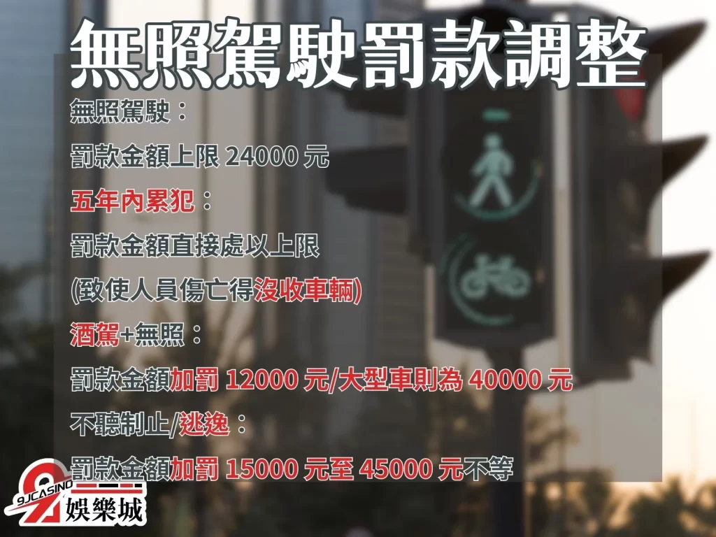 - 無照駕駛:交通違規罰款金額上限 24000 元