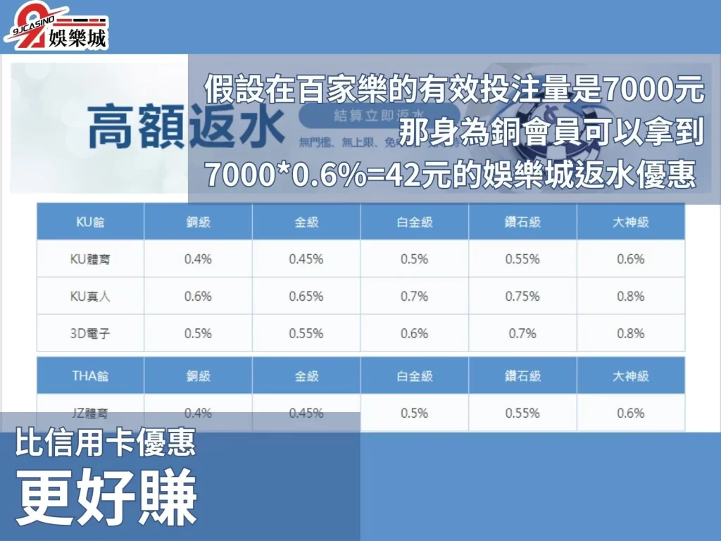 假如小編在百家樂的有效投注量是7000元,那身為最初級會員(銅)的小編可以拿到7000*0.6%=42元的娛樂城返水優惠。