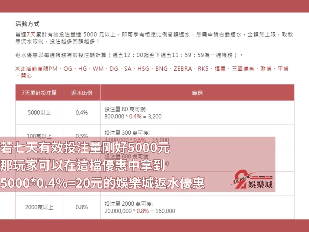 例如我七天有效投注量剛好5000元,那妳可以在這檔優惠中拿到5000*0.4%=20元的娛樂城返水優惠。
