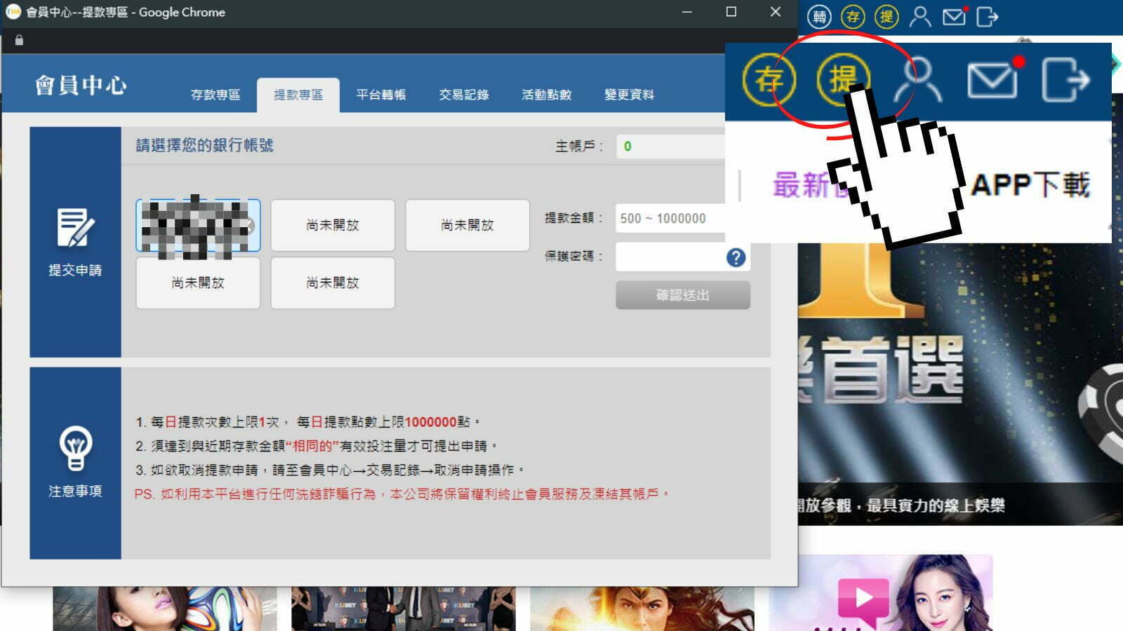 註冊儲值 註冊教學 提款教學 出金教學 3a娛樂城註冊流程教學 步驟一 >>進入3a娛樂城官網<<,找到上方藍色橫幅的「+免費註冊」按鈕。 步驟二 將會員帳號、暱稱、密碼以及手機號碼逐一填寫。確認送出後,再把驗證碼填入。 步驟三 為了儲值與出金安全,玩家需要提供「個人」銀行帳號與戶名。並且為了實名認證,也必須上傳身分證正面照片供系統核實。 3a娛樂城存款教學 銀行轉帳 步驟一 點入「銀行轉帳」,將存款金額輸入在空格中,確定送出。 步驟二 選擇轉入銀行;一次存款最少可以存100元。 步驟三 系統會給你一組帳號,請在付款有效期限內將款項轉入該帳號。 超商儲值 步驟一 點選「超商儲值」選項,並選擇欲進行交易之超商。 步驟二 選擇交易的超商門市。存款交易門市一經設定無法再更改。 步驟三 系統交易代碼輸入超商事務機列印出繳費單,交給店員完成繳款。 網路ATM 使用網路ATM存款請先插好讀卡機、安裝所需元件。並跟著系統指示輸入欲存款金額(最低100)、選擇收款銀行、填寫轉帳資料。 3a娛樂城出金申請教學 登入會員後點選網頁右上方「提款」按鈕進入系統提款專區。 一日申請次數以一次為上限,最多可提領100萬點,流水1倍。 (在申請出金前請務必完成綁定銀行帳戶的動作)